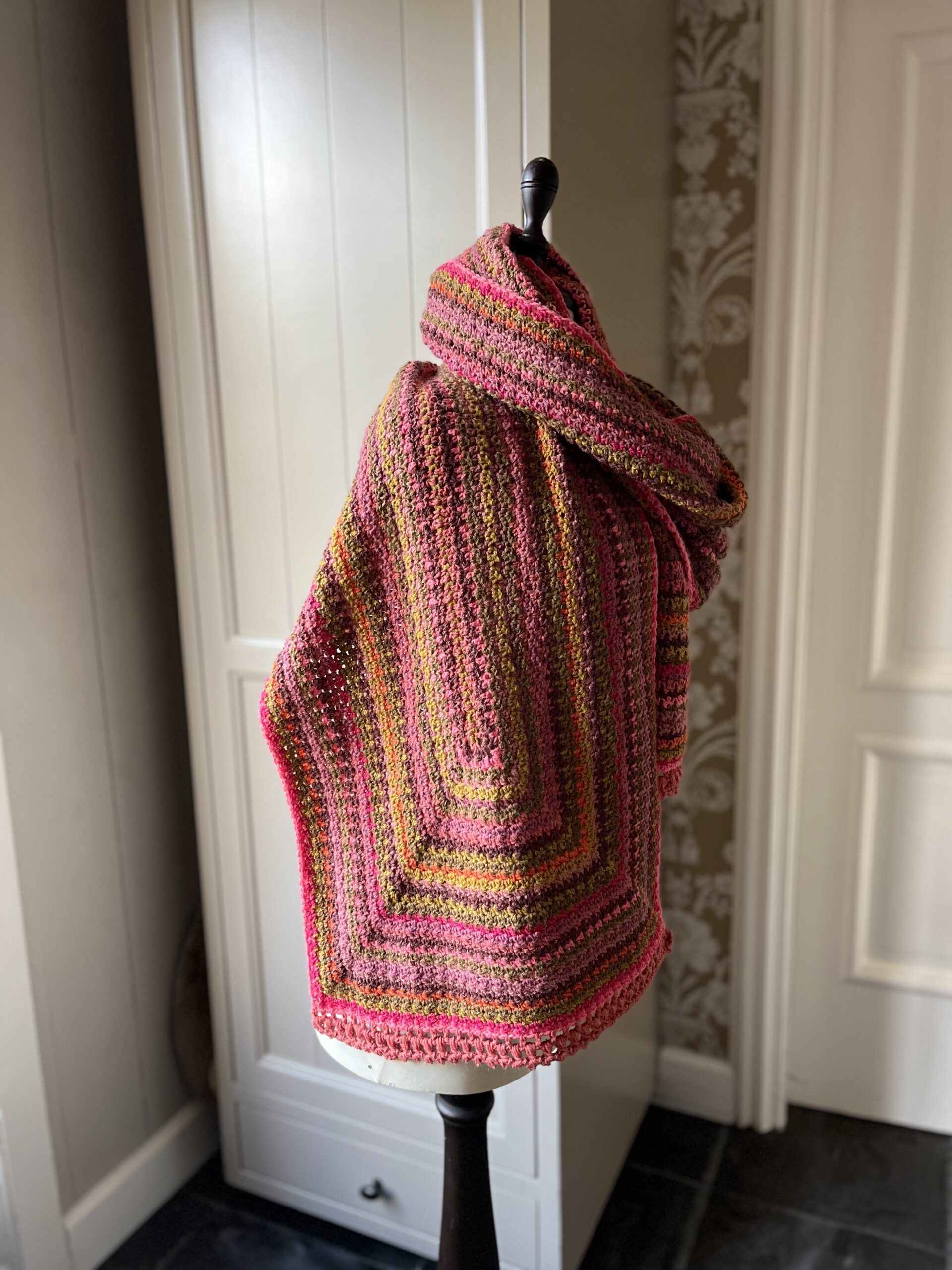 De sjaal combineert stijl en comfort met een ingetogen, maar verfijnd kleurenpalet van 9 harmonieuze tinten en een subtiel ‘versleten’ look. Gehaakt in mijn favoriete Pied de Poule steek, vanwege de twee verschillende kanten, straalt deze sjaal tijdloze elegantie uit en voelt hij heerlijk zacht aan.