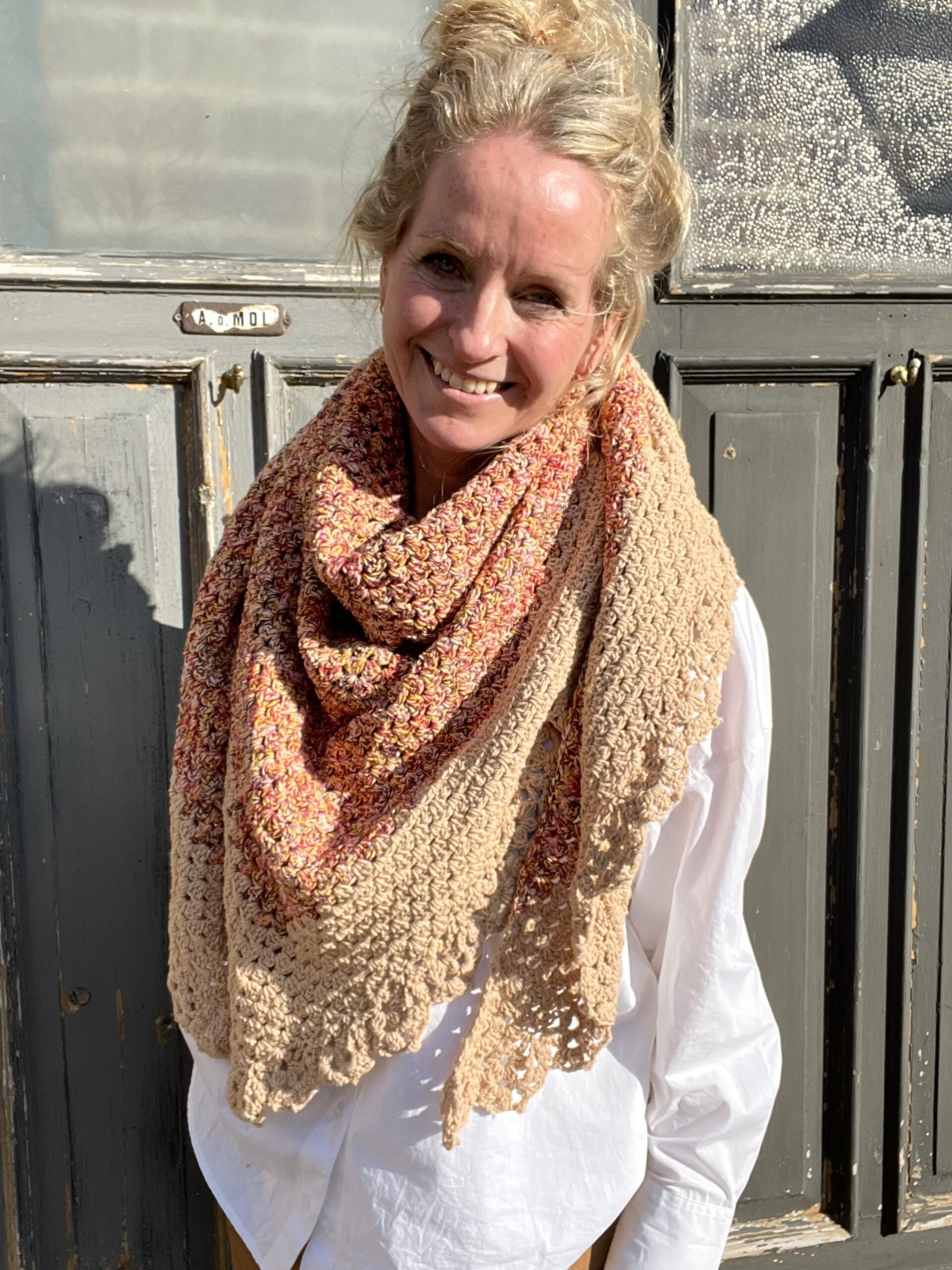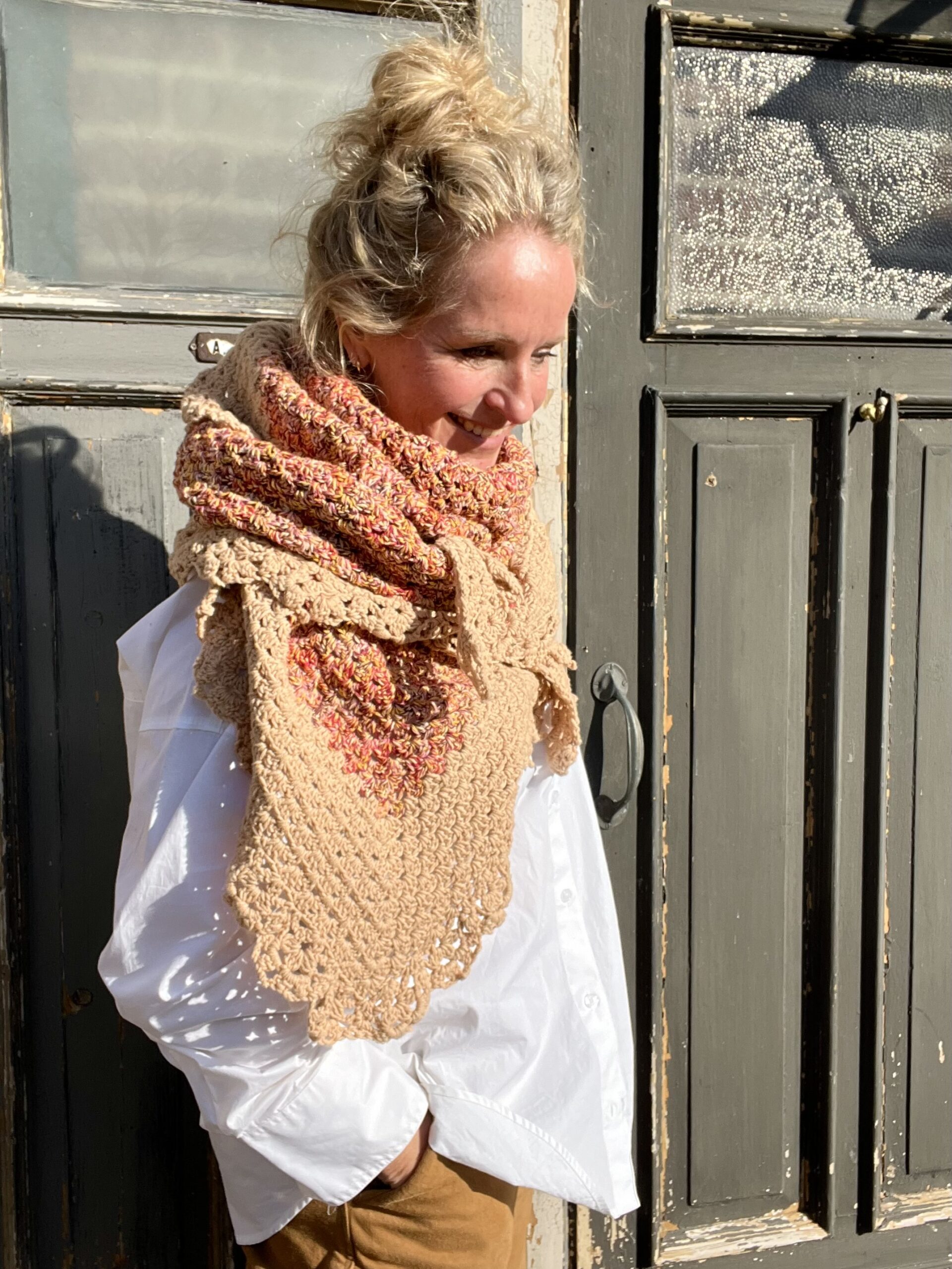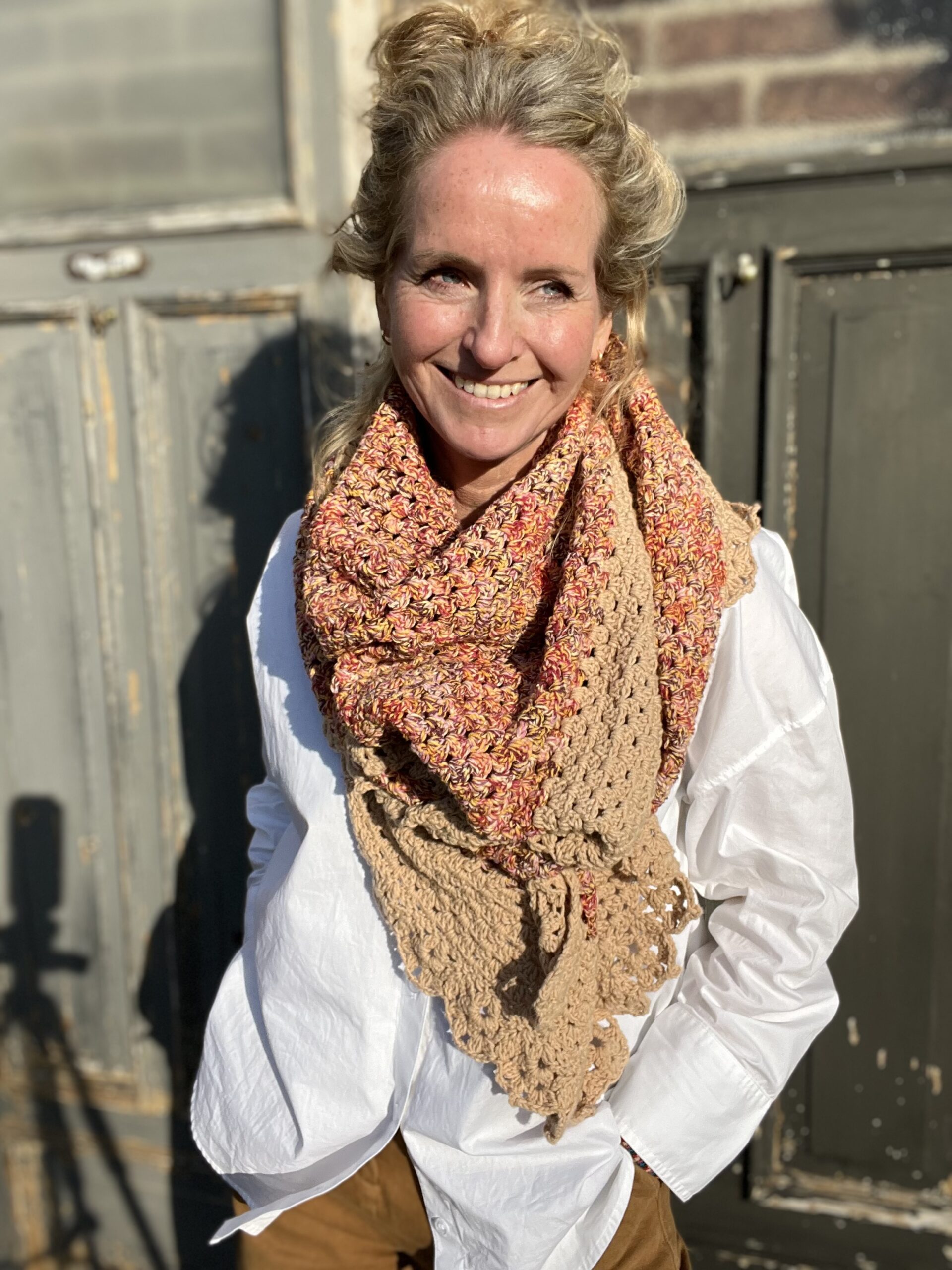 De omslagdoek wordt gehaakt in een klassiek granny patroon en afgewerkt met een sierlijke rand, wat zorgt voor een speels en verfijnd effect. Draag hem losjes om je schouders tijdens koele ochtenden of frisse avonden, of combineer hem met een jas voor extra warmte in de winter. Dankzij het tijdloze ontwerp is deze sjaal geschikt voor elk seizoen.