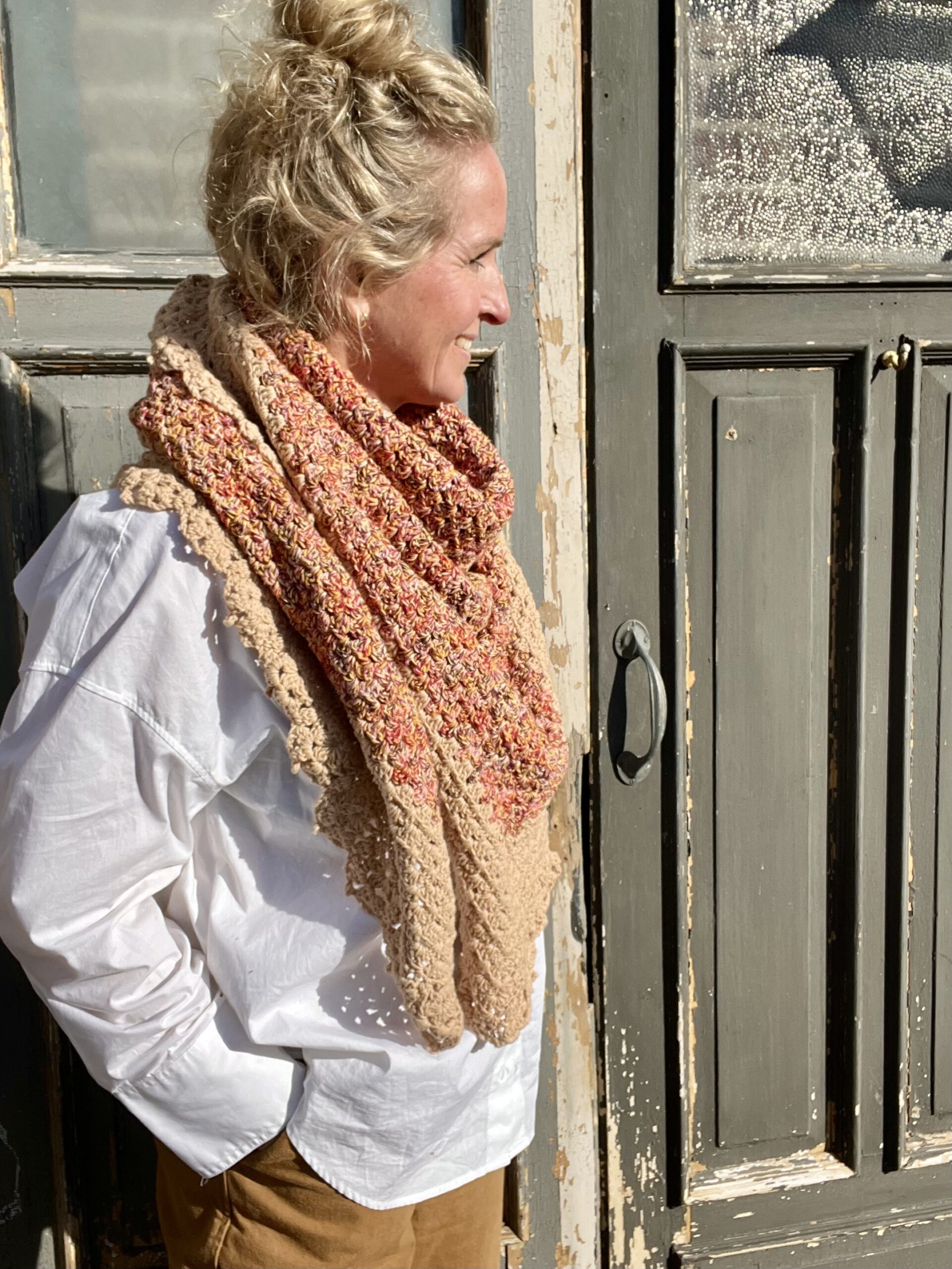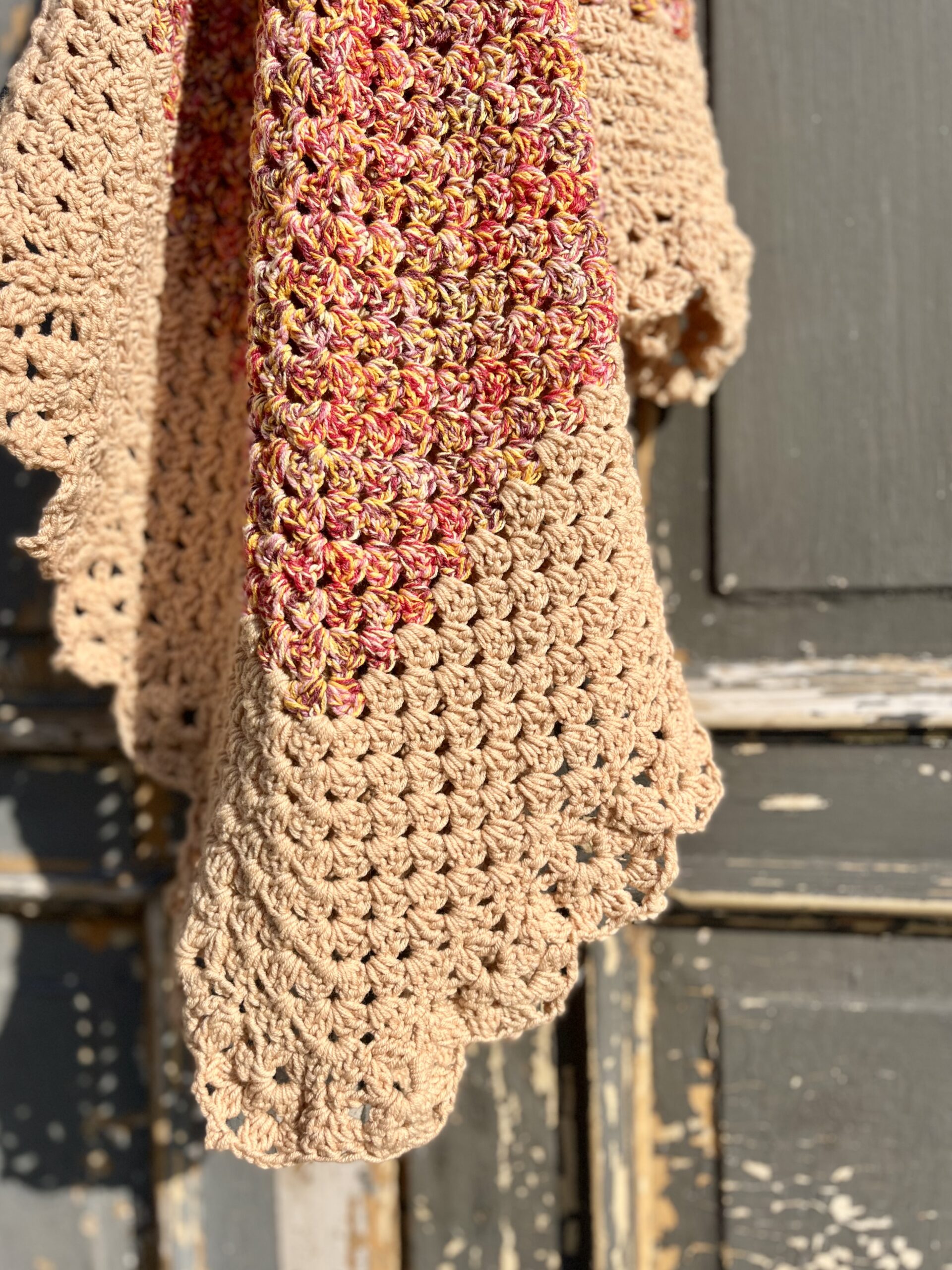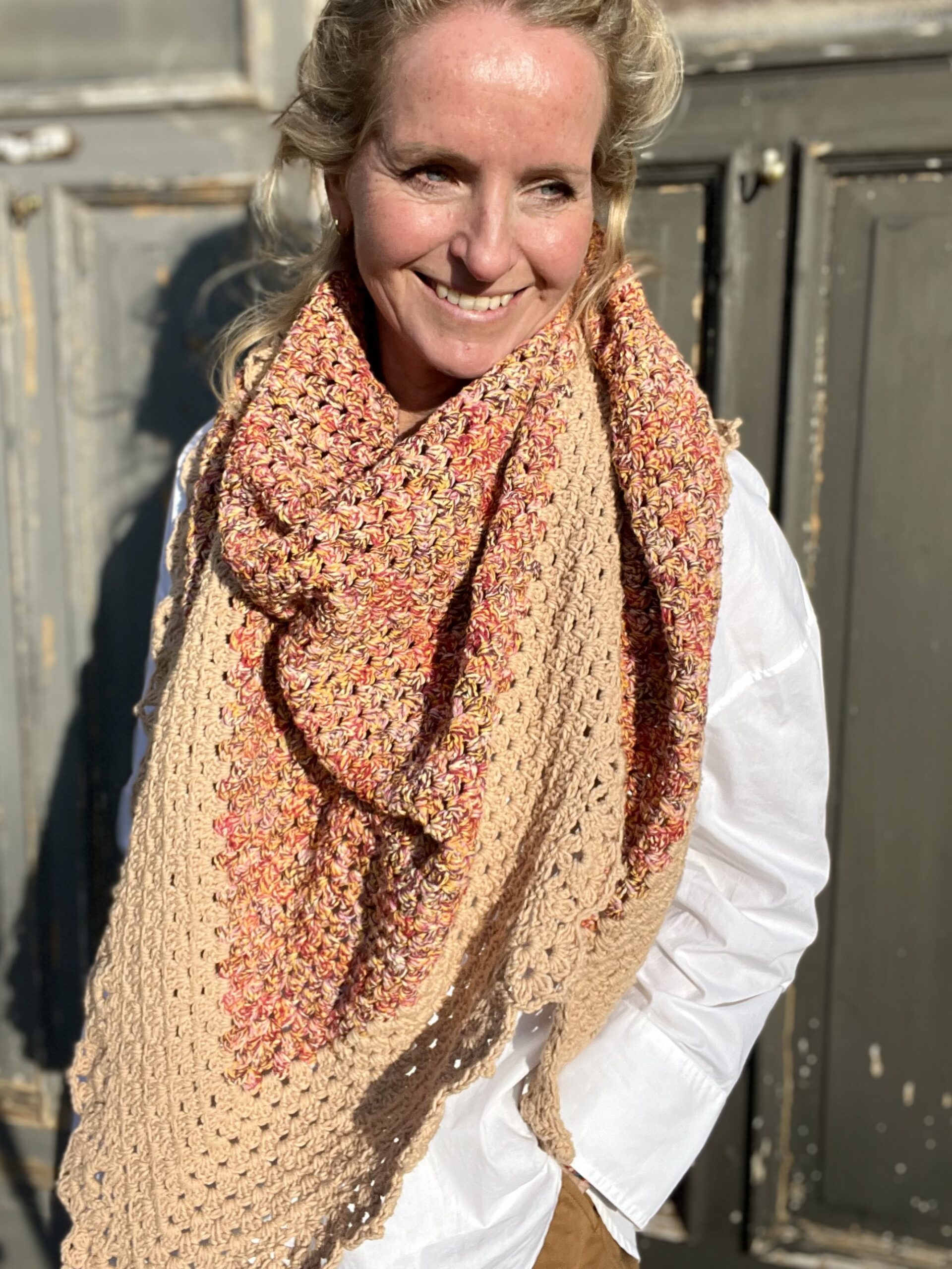 De omslagdoek wordt gehaakt in een klassiek granny patroon en afgewerkt met een sierlijke rand, wat zorgt voor een speels en verfijnd effect. Draag hem losjes om je schouders tijdens koele ochtenden of frisse avonden, of combineer hem met een jas voor extra warmte in de winter. Dankzij het tijdloze ontwerp is deze sjaal geschikt voor elk seizoen.