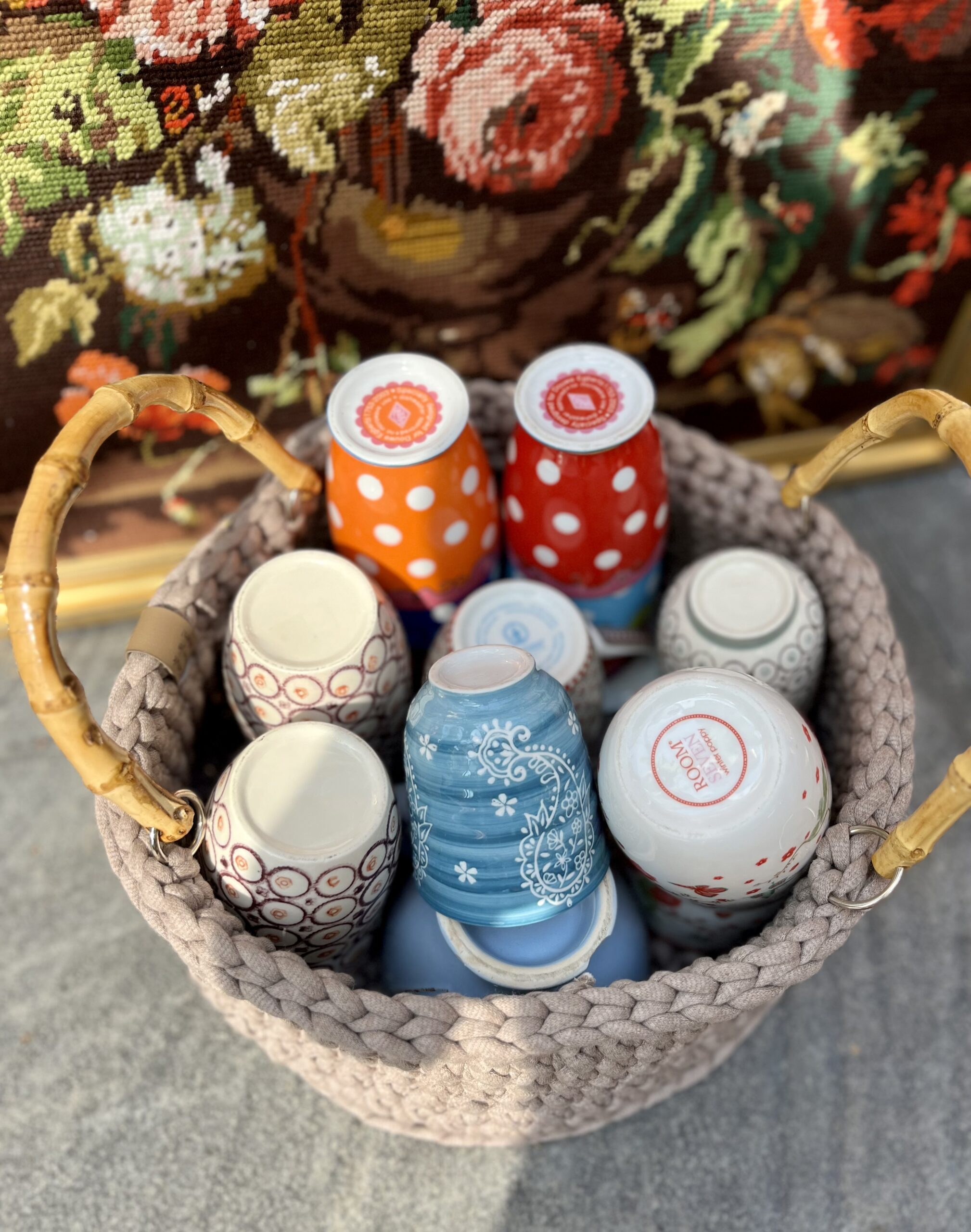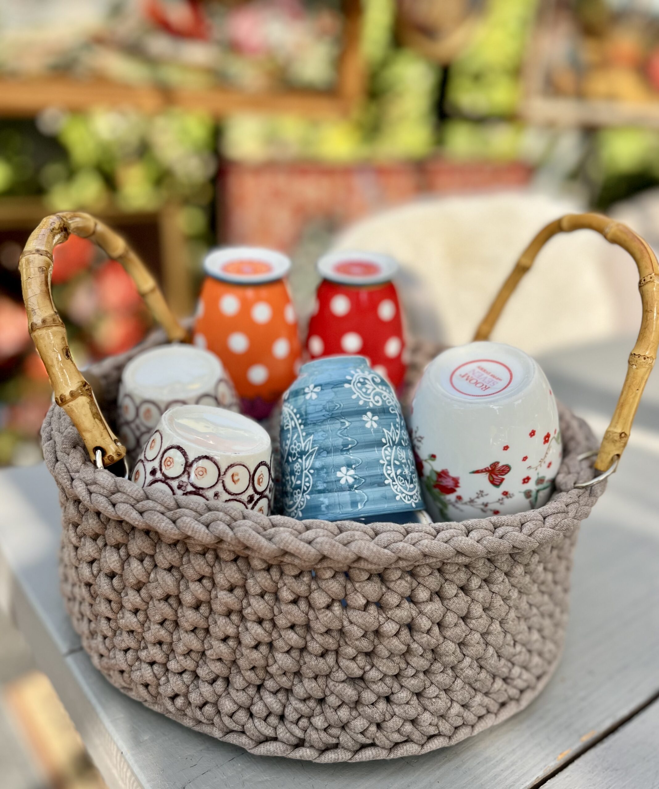 Dit haakpakket van de mand in kruissteek, is een leuke aanvulling op het populaire haakpakket van de (stok)broodmand. Andere vorm, maar superleuk voor dezelfde toepassingen zoals voor allerhande spulletjes, je haak- of breiprojecten, een windlicht, als plantenmand, of zoals afgebeeld; als ‘storage’ voor je mooiste servies. Of wat dacht je als broodmand op een feestelijk gedekte tafel..?
