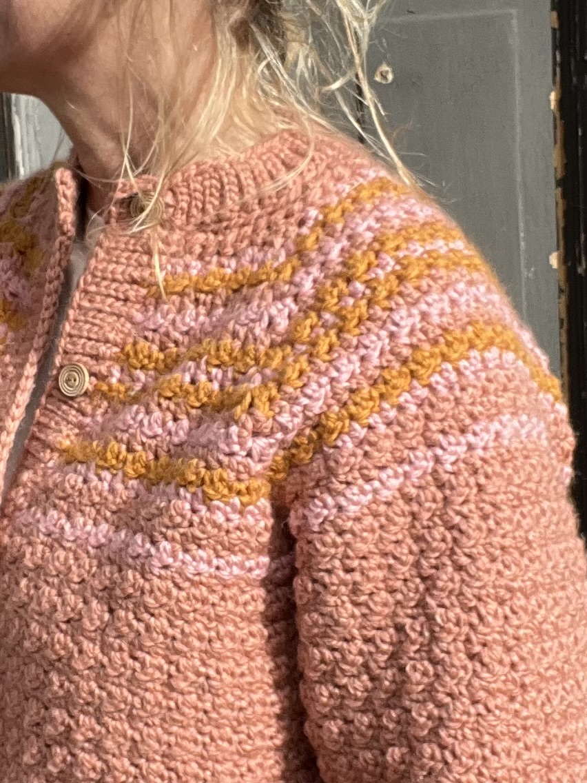 Weer later haakte ik het oud roze model, waarbij ik de boorden met halve vasten haakte. Niet echt het leukste klusje moet ik eerlijk zeggen, maar met een resultaat alsof de boorden gebreid zijn.