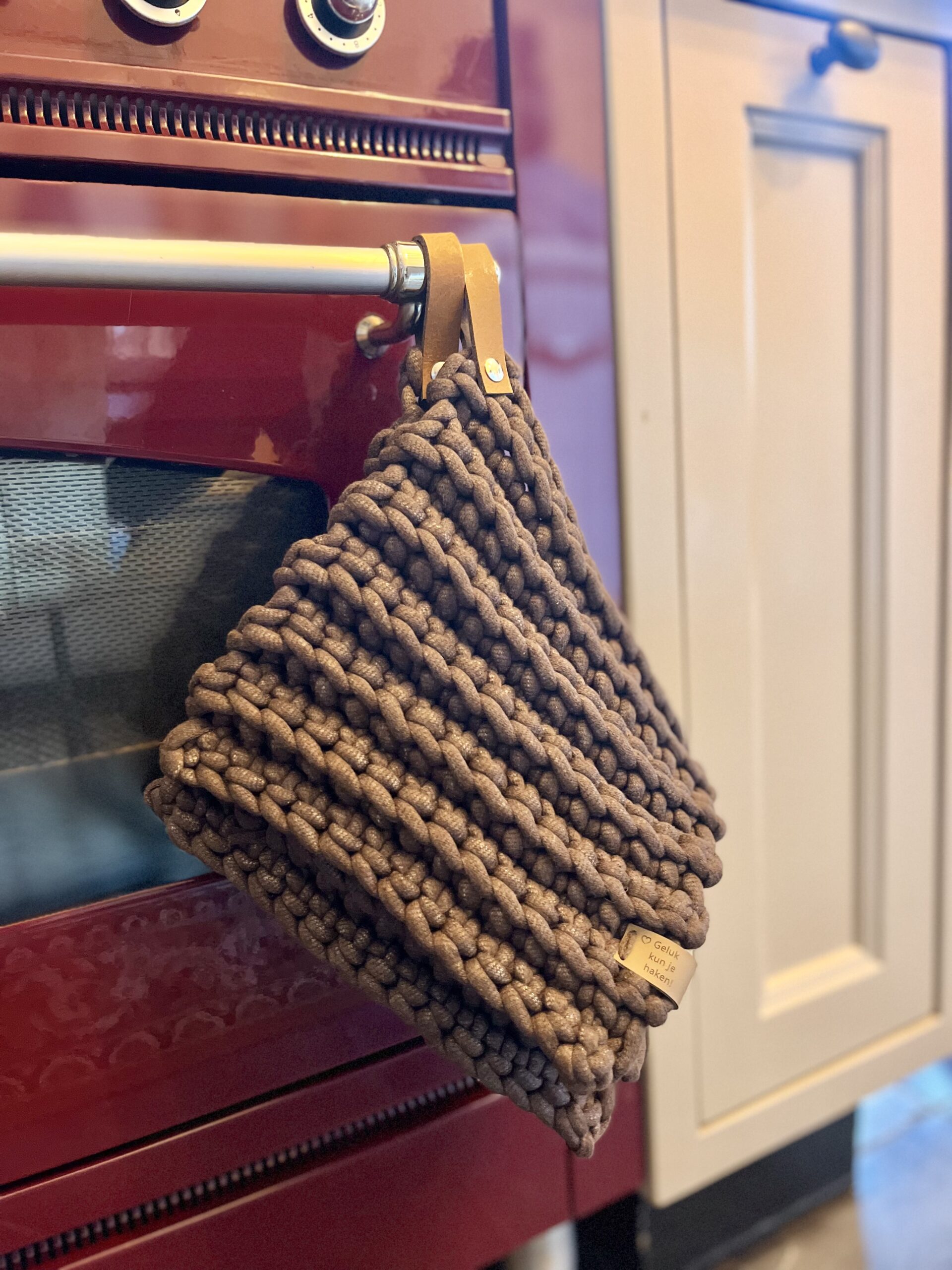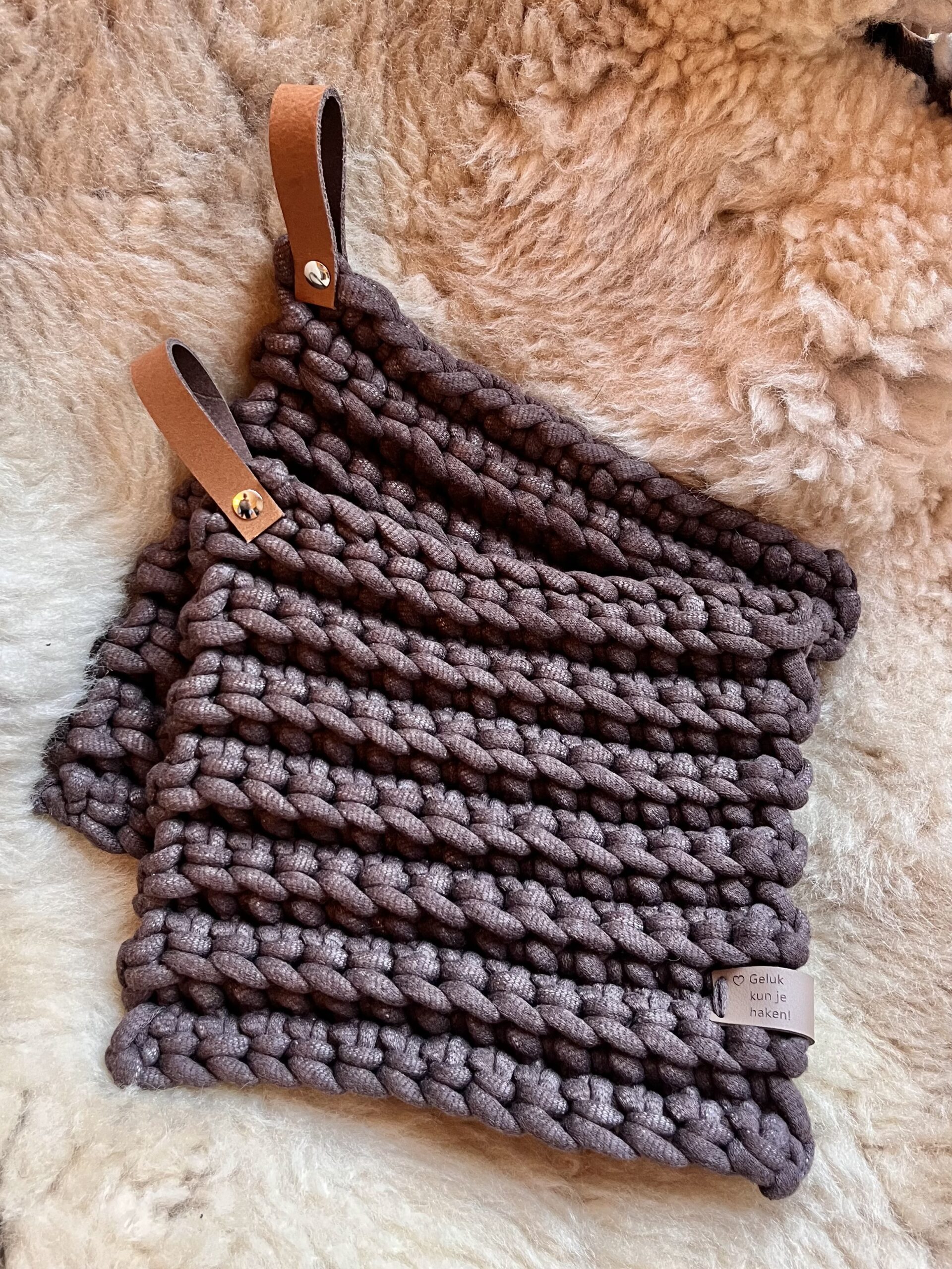 Pannenlappen met leren lus, want hoe vaak hoor je het niet? “Ik haak wel een pannenlap!” – hét antwoord van iedereen die denkt dat haken moeilijk is. Met dit haakpakket maak je die uitspraak nu écht waar. In dit complete DIY haakpakket vind je alles wat je nodig hebt om zelf prachtige gehaakte pannenlappen te maken.